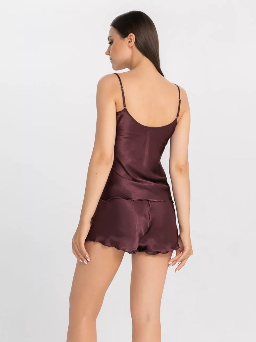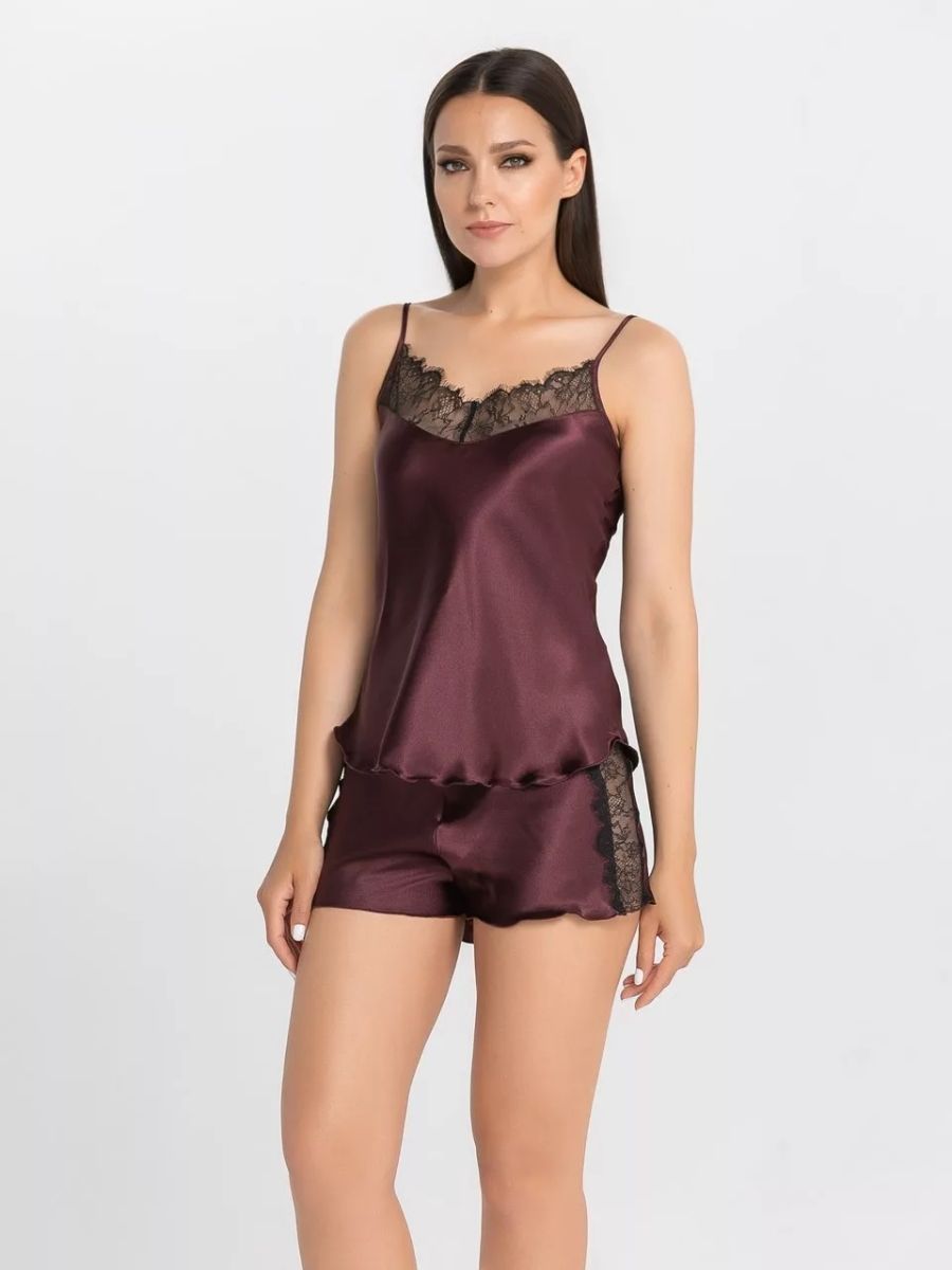 Комплект: топ и шорты из искусственного шелка, узкие бретели. Декорирована кружевом по линии выреза. В комплекте: топ, шорты.
