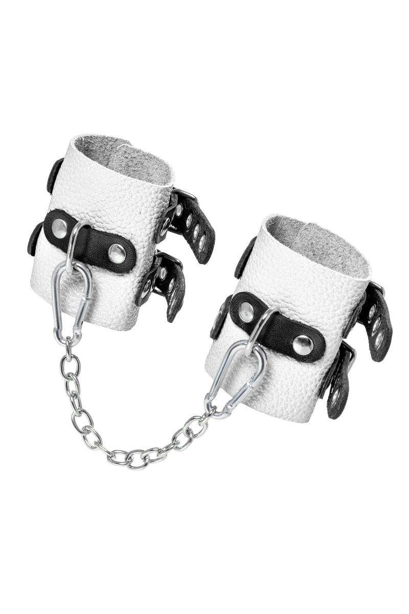 Основатели бренда уверены: лучший способ избавиться от искушения - поддаться ему! Мягкие, белые, кожаные наручники с двумя чёрными, жёсткими ремнями могут стать стильным аксессуаром, а могут послужить вашим целям по своему прямому назначению. Частичное обездвиживание и невозможность двигать руками дают вам полную власть над партнером – взрослые игры для взрослых. Наличие двух колец и карабинов, соединенных между собой металлической цепочкой, позволяет использовать изделие как раздельно – аксессуар-манжеты, так и как наручники для фиксации. К широким металлическим кольцам также можно присоединить и другие аксессуары при помощи карабинов. Благодаря универсальному размеру наручники могут использоваться и мужчинами, и женщинами. Длина манжет - 18 см, ширина - 7 см. Длина сцепки - 17 см.
