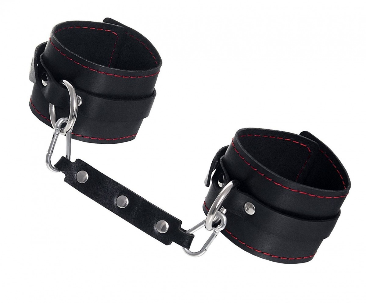 Эти однослойные кожаные оковы с контрастной строчкой красного цвета могут стать стильным аксессуаром, а могут послужить вашим целям по своему прямому назначению. Частичное обездвиживание и невозможность двигать руками или ногами дают вам полную власть над партнером – взрослые игры для взрослых. Наличие двух колец и карабинов, соединенных между собой кожаным ремешком, позволяет использовать изделие как раздельно – аксессуар-манжеты, так и как оковы для фиксации. К широким металлическим кольцам также можно присоединить и другие аксессуары при помощи карабинов. Благодаря универсальному размеру оковы могут использоваться и мужчинами, и женщинами. Размер легко регулируется с помощью металлических пряжек, органично вписывающихся в общий стиль. Длина манжет - 25 см, ширина - 6,5 см. Длина сцепки - 17 см.