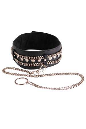Изготовлен из натуральной кожи с велюровой подкладой. При изготовлении использована никелированная фурнитура. Размер универсальный. Ширина - 5 см. Длина цепочки (поводка) с карабином - 50 см.