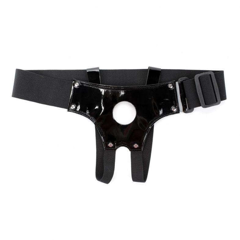 Трусики для страпона черного цвета, изготовлены блестящего лакового материала. Внутренняя поверхность из мягкого, бархатистого материала. Крепятся при помощи широких эластичных резинок (размер легко меняется). Диаметр отверстия для страпона - 4 см.