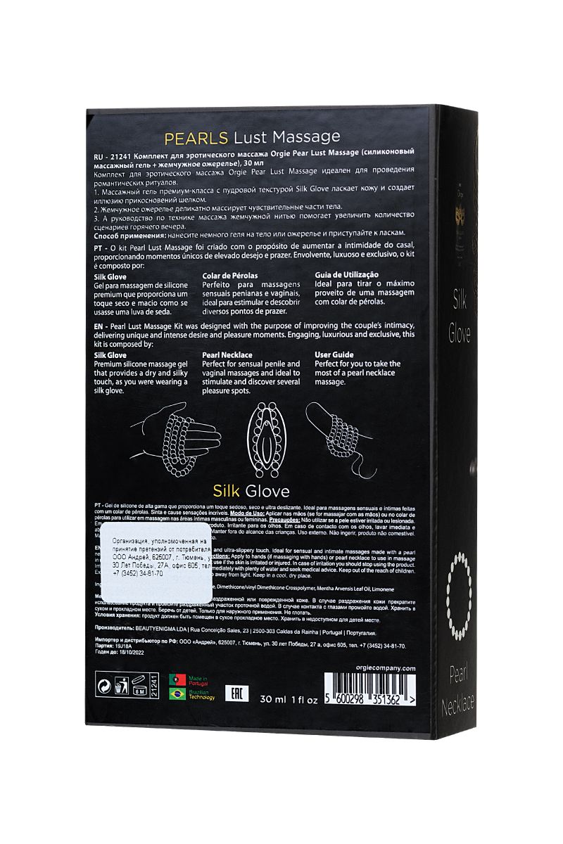 Набор для эротического массажа Orgie Pearl Lust Massage состоит из силиконового массажного геля (30 мл.) и ожерелья из бусинок под жемчуг. С помощью бус, смазанных гелем, можно выполнить чувственный массаж ствола полового члена, сосков или предвагинальной области.