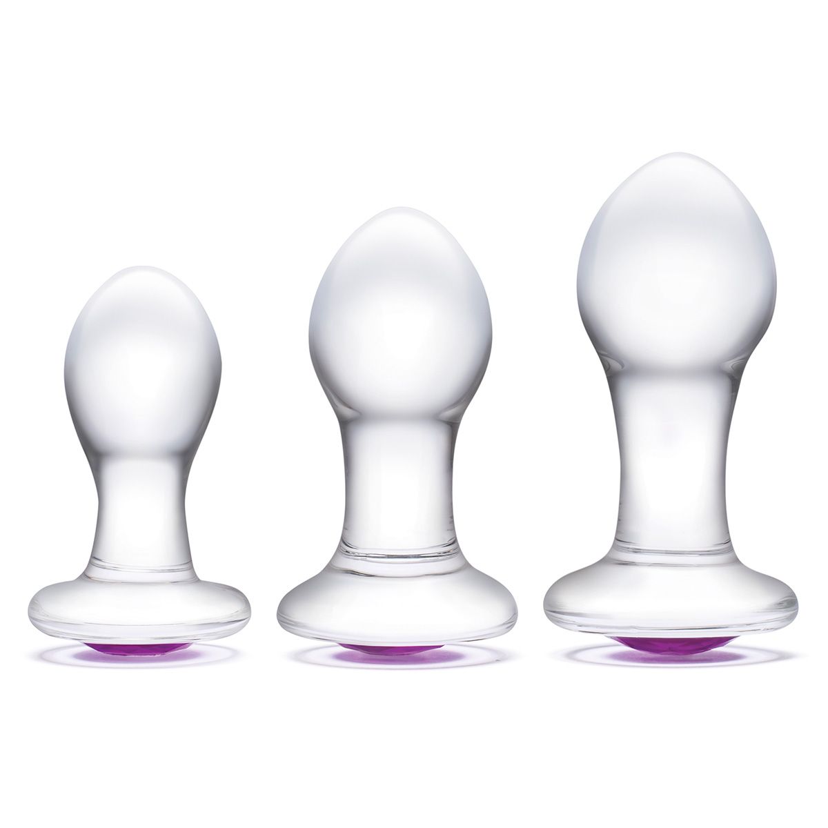 Набор для анальных тренировок из прочного стекла, включающий в себя анальные плаги одинаковой формы, но трех разных размеров. Изготовленные из высококачественного непористого и гигиеничного стекла, эти пробки имеют градуированные размеры, чтобы пользователи могли с комфортом тренировать свое тело, и постепенно переходить к анальным игрушкам большего размера. Каждая пробка имеет в основании рельефный фиолетовый стеклянный кристалл, очень красиво переливающийся на свету. Рабочая длина большой пробки – 8,3 см., диаметр – 3,8 см. Рабочая длина средней пробки – 7 см., диаметр – 3,6 см. Рабочая длина малой пробки – 6,5 см., диаметр - 3,3 см.